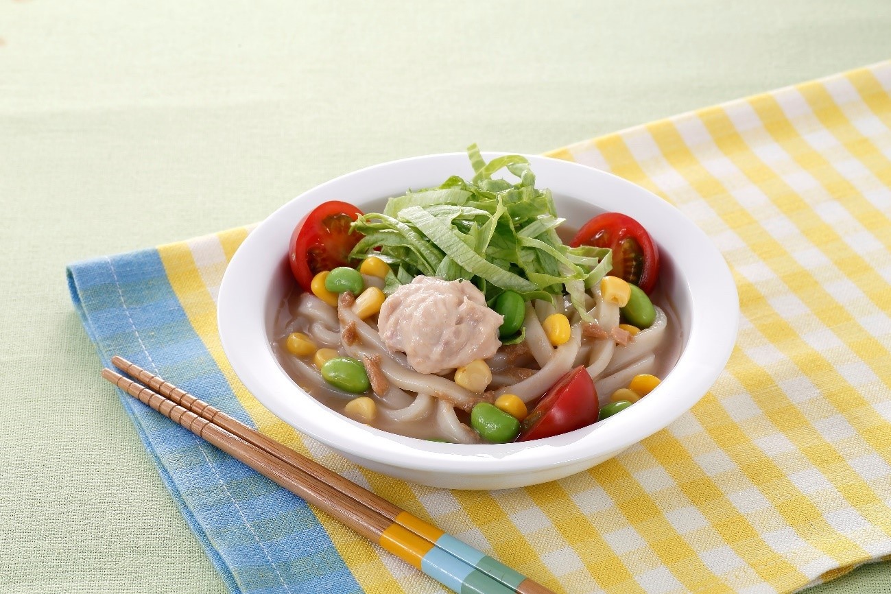 - ボウルにシーチキンマヨネーズタイプを2袋、四穀つゆ、水、キッズうどんを入れて混ぜ合わせる。