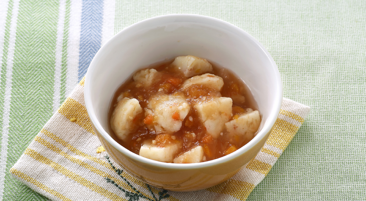 ふんわりつみれのトマト煮 材料(1人分) 約15分 国産大豆と角切り野菜入りトマトコンソメソース・・・2個 北海道産白身魚と国産野菜のふんわりつみれ・・・2個 水・・・大さじ1 作り方 つみれはパッケージ裏面の通りにレンジで加熱して1cm角に切る。 小鍋にトマトコンソメソースと水を入れて弱火にかけて、溶けて沸騰してきたら①を加えて2~3分煮込む。 もぐもぐ期(7か月頃~) カレー野菜串バーグ うずまきチーズちくわパン 関連記事 白菜のにんじんそぼろかけ 2026年2月16日 大根とそぼろのとろみ煮 2026年1月5日 ささみとトマトのこまつな煮 2025年12月24日 おさかなボロネーゼ 2025年12月17日 簡単リゾット風 2025年11月26日 かぼちゃのツリー風お焼き 2025年11月23日 おさかなコーン 2025年10月26日 モンスターかゆ 2025年9月25日