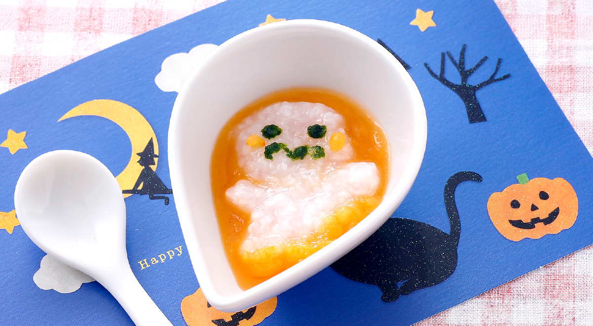 - ほうれん草は刻んですりつぶし、白かゆもつぶしておく。しずく型の器になめらかキューブを入れ(少量残しておく)、白かゆをおばけの形にのせる。