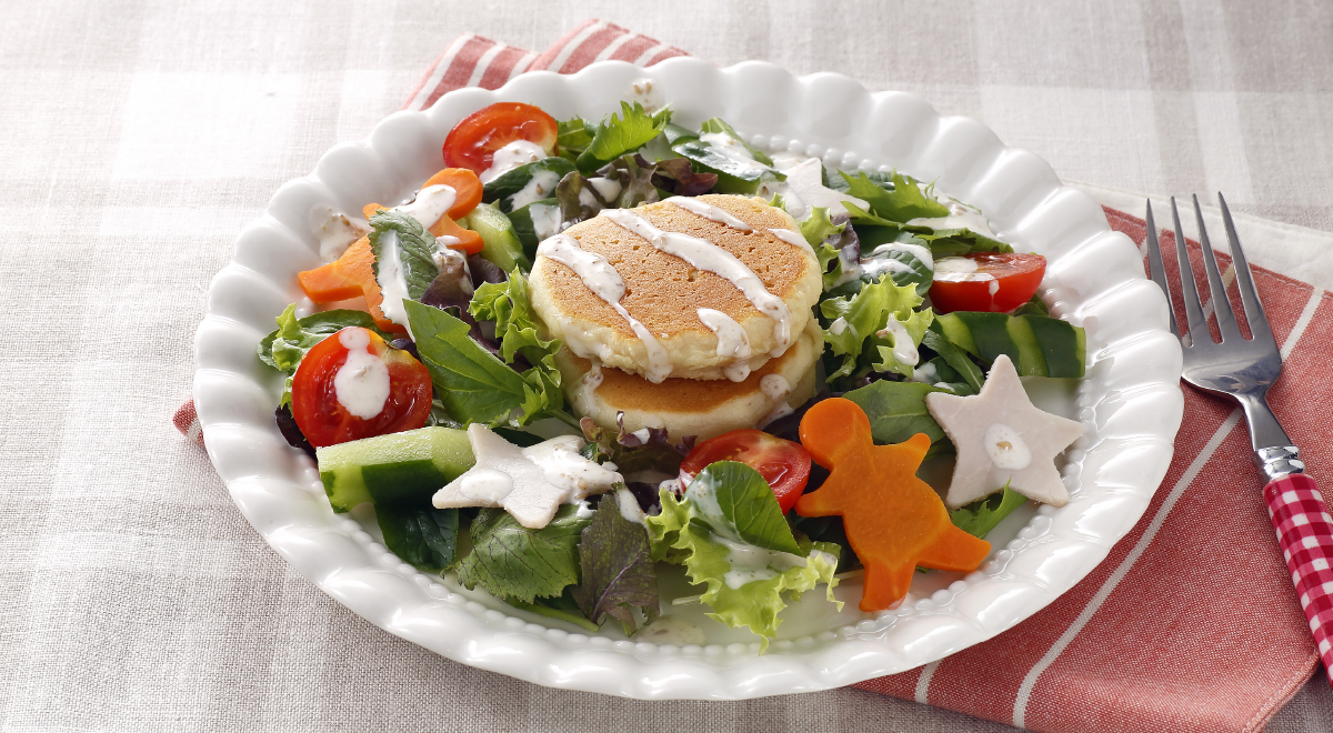 - 器の中央に②を盛り付けて、周りにベビーリーフ、野菜、ハムを飾り、混ぜ合わせた★をかける。