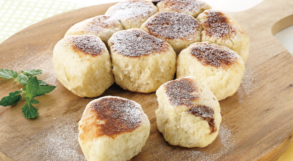 - 生地を10等分にして平らにのばして、チョコレートを包み、フライパンに並べる。