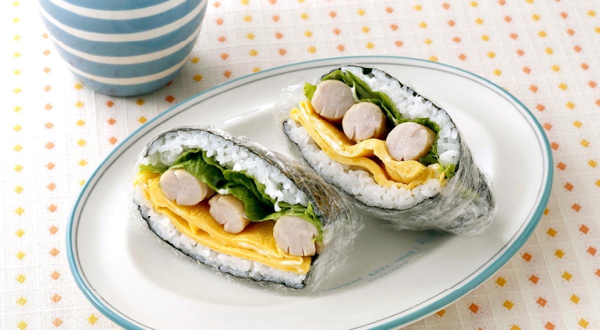 薄い卵焼きを2枚焼く。ウインナーは切り目をいれて炒める。 - ラップに海苔をひき、半量のごはんを海苔の上に広げて手前側にレタス、マヨネーズ、