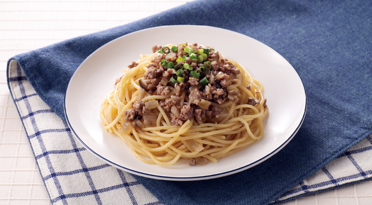 - フライパンを熱してごま油を入れて、ニンニク、合い挽き肉を炒めて塩・こしょうを振り、色が変わったらたまねぎ、しめじを加える。火が通ってきたらつゆ、水を加え❶の麺を加えて全体を絡めて小ねぎを振る。