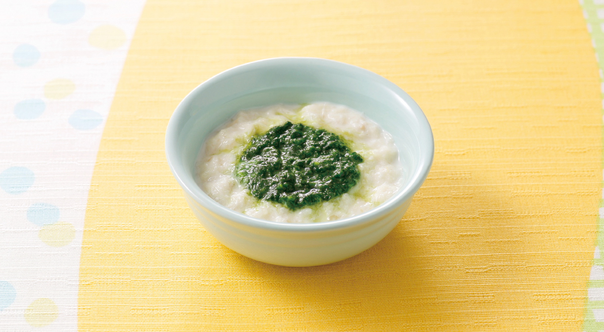 - すりつぶしたほうれん草にお湯(大さじ1/2弱)を加えてのばして、②にのせる。