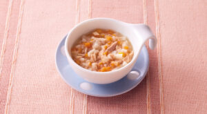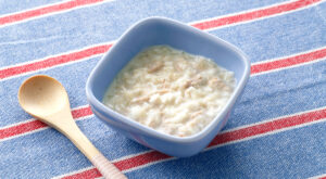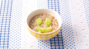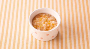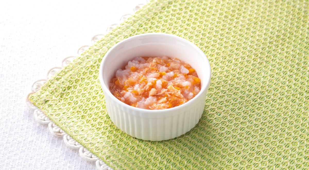 - 白かゆは裏面通りレンジで加熱し、すりつぶして❷を混ぜ合せる。