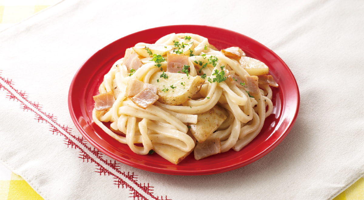 うどんは裏面通りにレンジで解凍しておく。 - フライパンを熱してバターを入れて中火でベーコン、❶の新じゃがいもを入れて炒める。