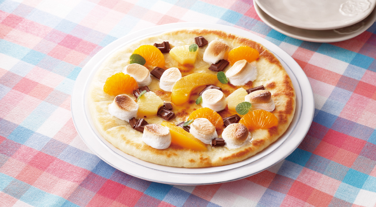 アルミホイル※を敷いたフライパンにのせて蓋をして弱火で10分焼き、裏返して5~6分焼き取り出す。 - ❷をトースターの天板にのせ、はちみつを塗り、チョコレート・マシュマロ・フルーツを飾り