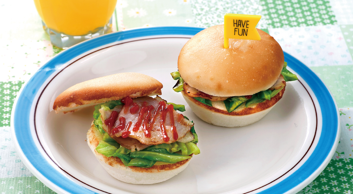 ②を1/4パンにのせ、ベーコンも1枚のせる。ケチャップを上から塗り、パンをのせる。