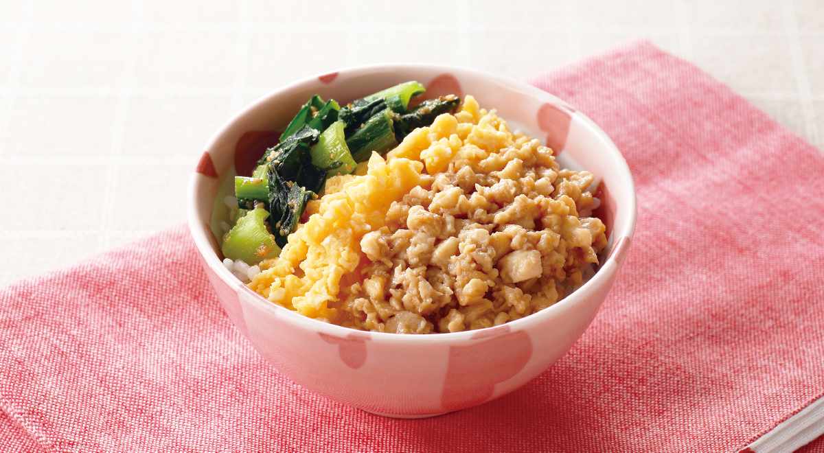 取り出し、そぼろ状になるまで混ぜる。 - 小松菜とごまあえの素を混ぜ合わせる。器にごはんを盛り、1/2の量の①・②・小松菜を彩り良く